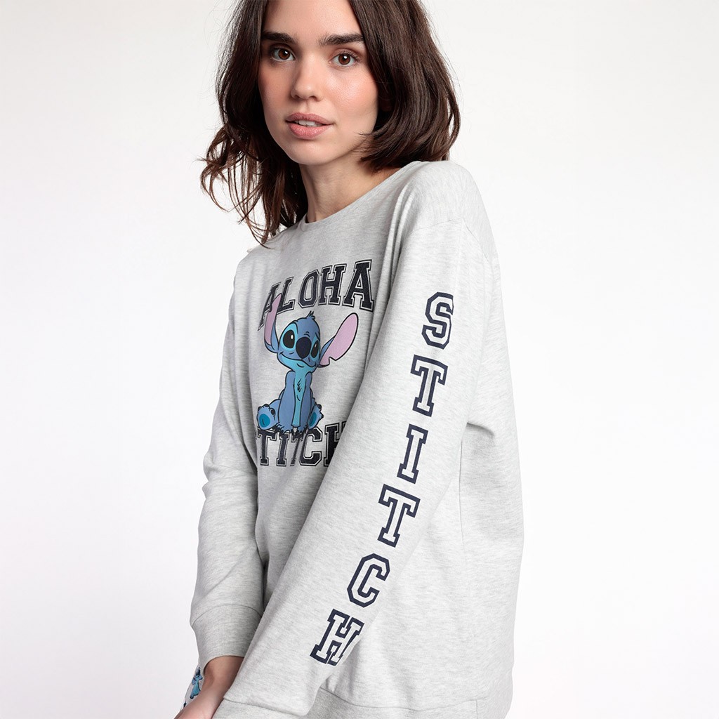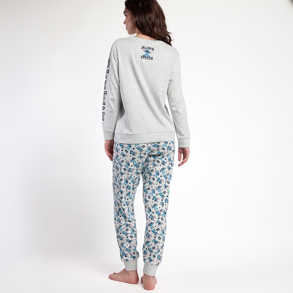 Pijama de mujer compuesto por camiseta de manga larga con dibujo de Stitch en el pecho y pantalón estampado con puños en bajo. Presentado en caja con diseño a juego.
