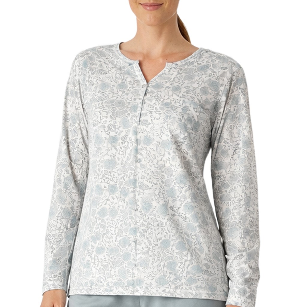 Pijama de mujer de manga larga confeccinado en tejido de algodón con camiseta estampada y cuello de botones y pantalón en color liso a juego. Presentación en caja.