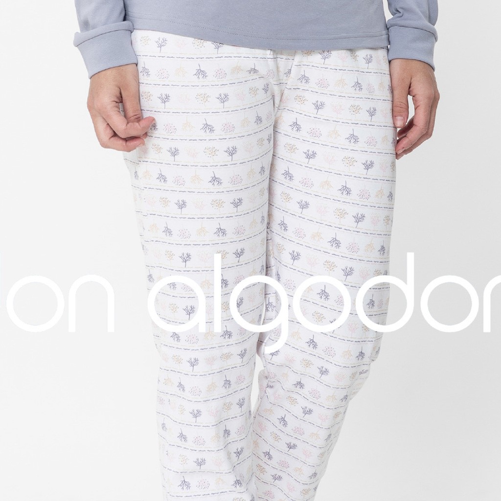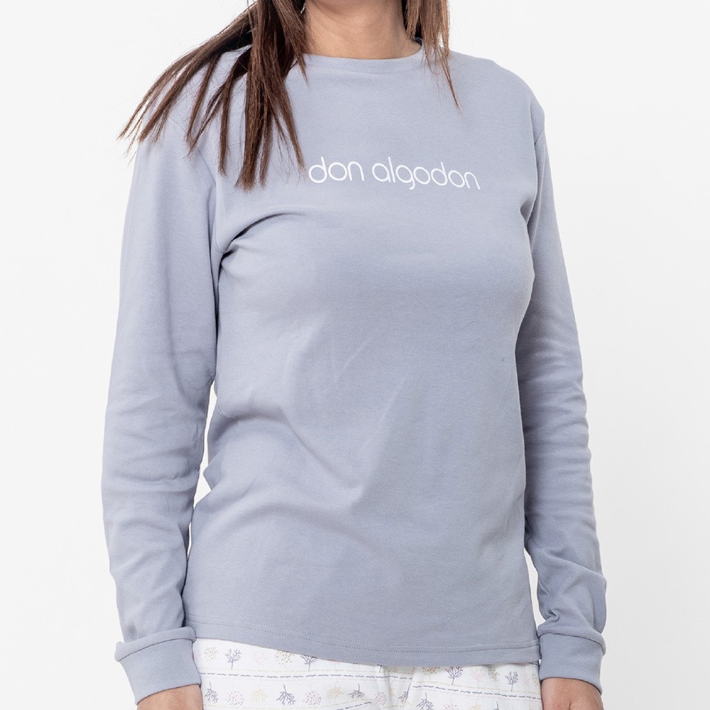 Pijama para mujer de punto interlock que combina camista de manga larga con logo de la marca impreso en delantero y pantalón largo estampado. De la marca don algodon. Presentación en caja.