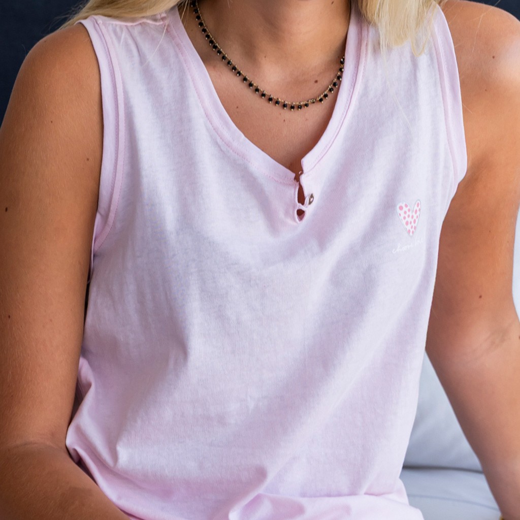 Pijama de mujer compuesto por camiseta sin mangas y cuello con botones y pantalón microestampado con bolsillos, en tejido de algodón. Presentado en caja.