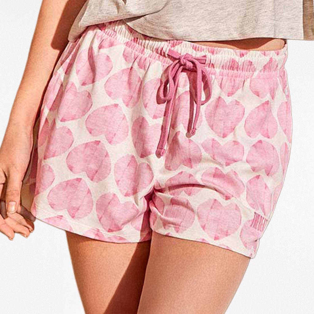 Pijama de mujer que combina camiseta de manga corta en tejido de algodón a juego con pantalón corto con cordón en cintura y estampado de corazones. Presentado en cajita.
