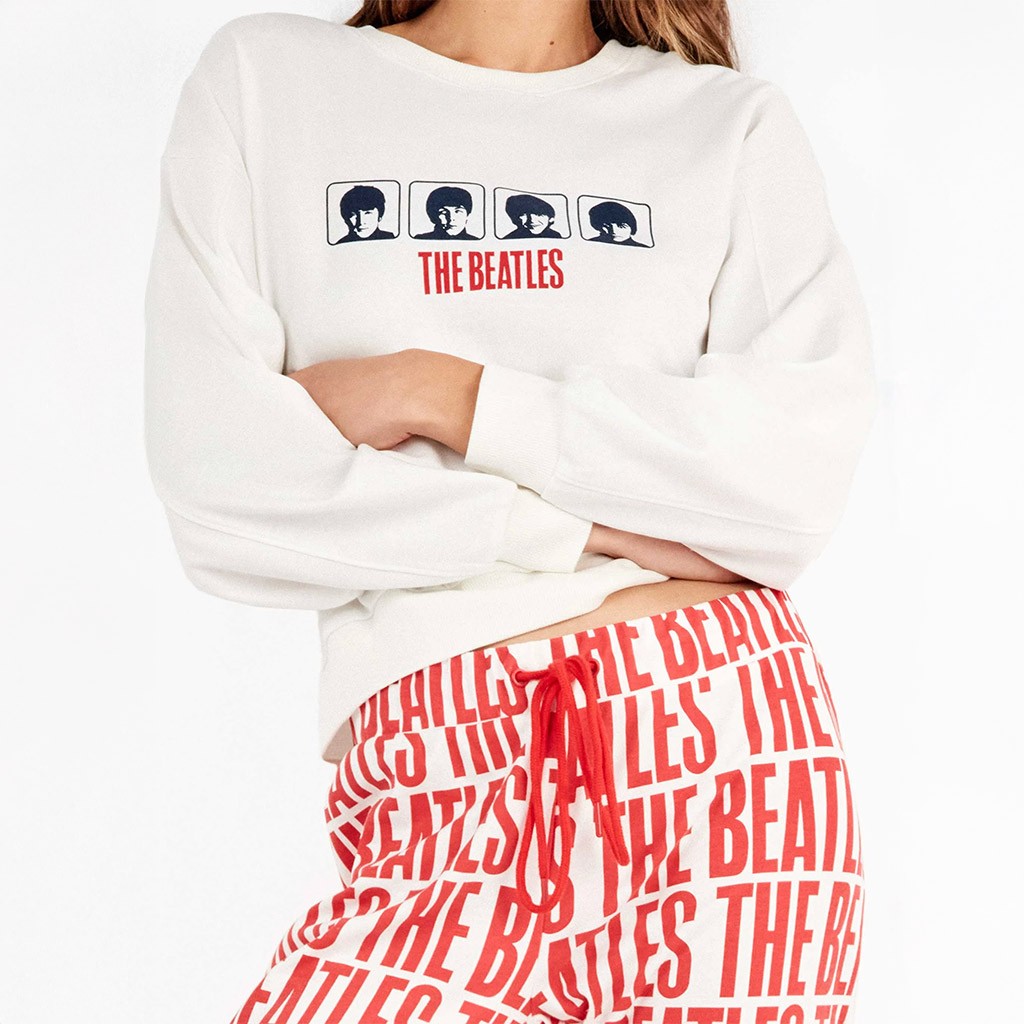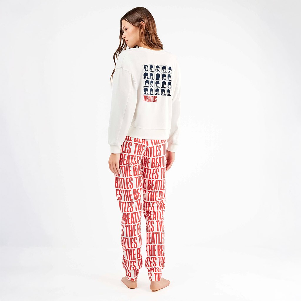 Pijama de manga larga para mujer compuesto por camiseta con dibujo impreso en el pecho y pantalón estampado con nombre de The Beatles. Presentado en caja con diseño a juego.