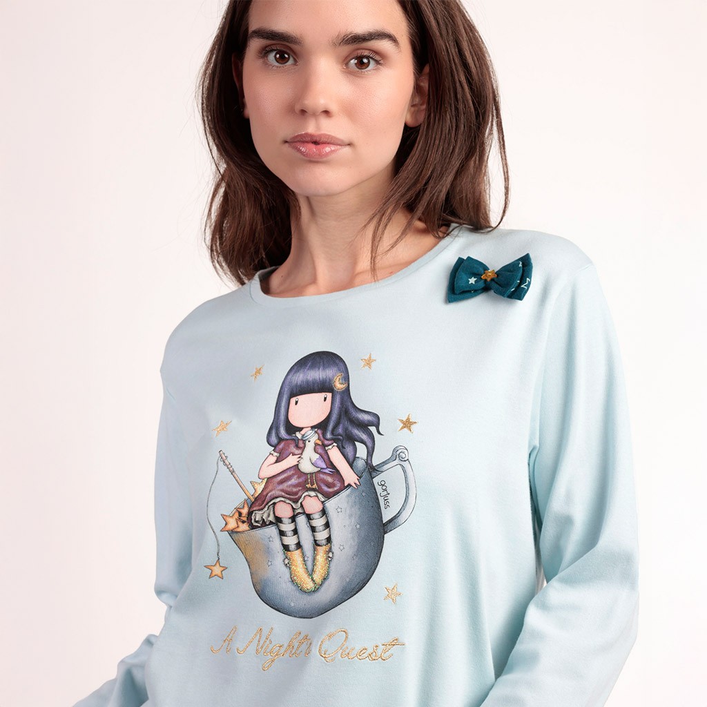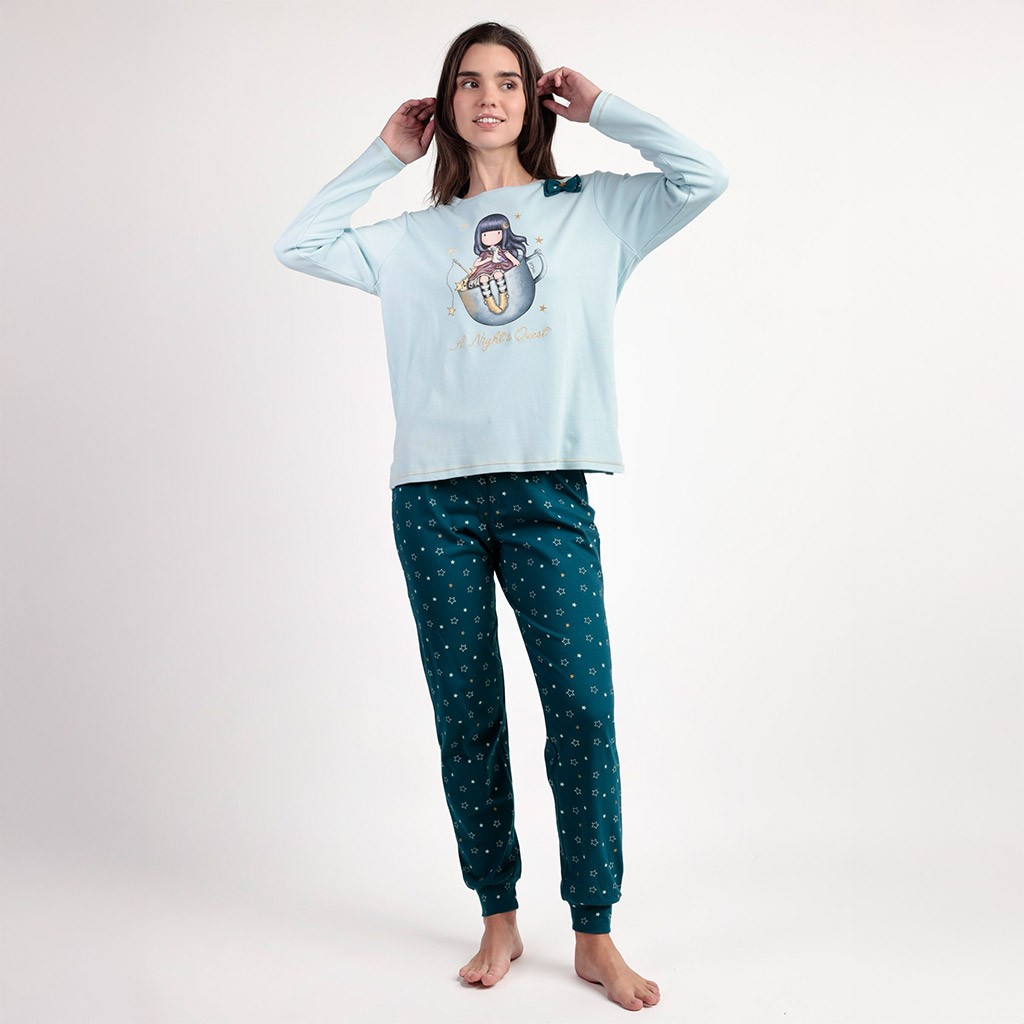 Pijama de mujer de manga larga con dibujo en camiseta de muñeca Santoro a juego con pantalón estampado en color a contraste. Presentado en cajita con diseño Gorjuss.