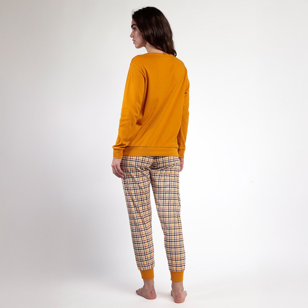 Pijama para mujer en tejido de algodón de la marca Admas, que combina camiseta de manga larga con aplique bordado en delantero a juego con pantalón de cuadros con puños elásticos. Presentado en caja.