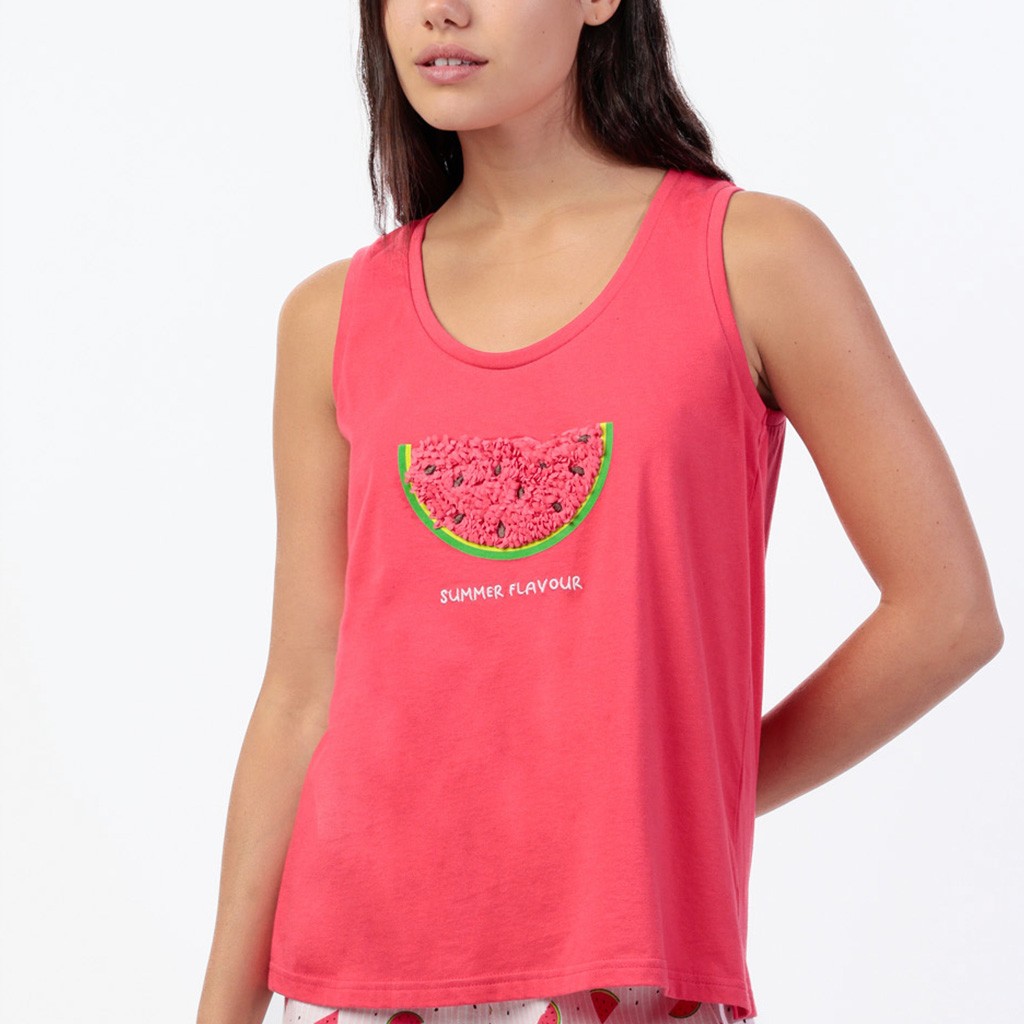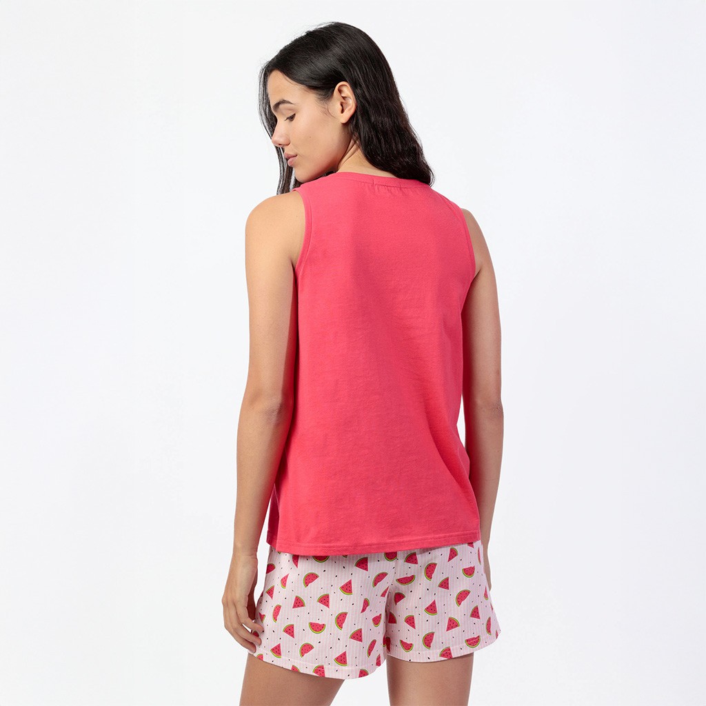 Pijama de mujer confeccionado en algodón con camiseta de tirantes y dibujo delantero que combina con pantalón corto estampado. Presentación en caja.