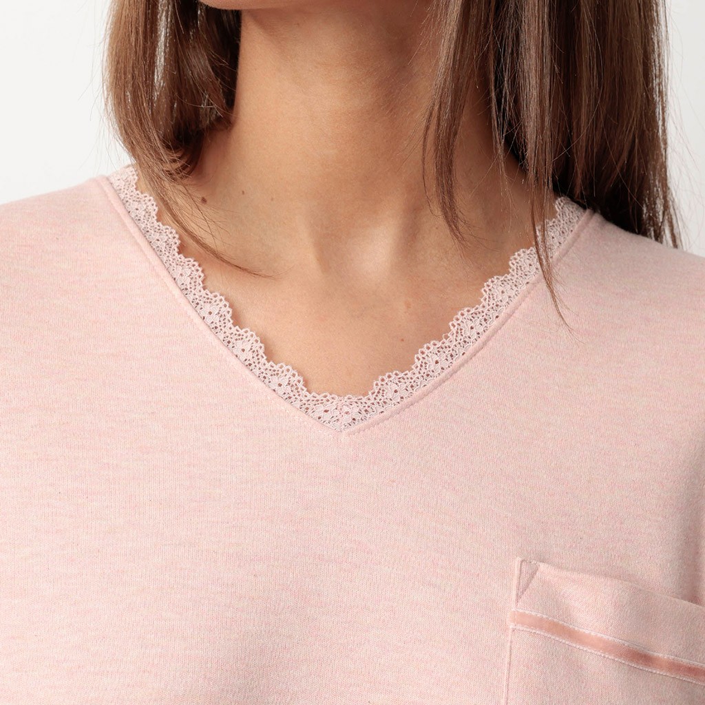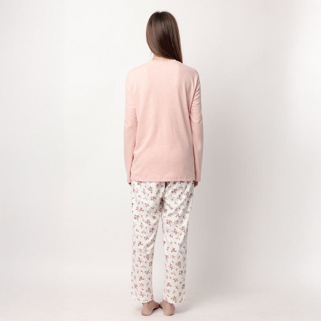 Pijama largo de mujer con camiseta de cuello de pico con puntilla y detalle de bolsillo en el pecho que combina con pantalón recto estampado. De la marca Admas. En caja.