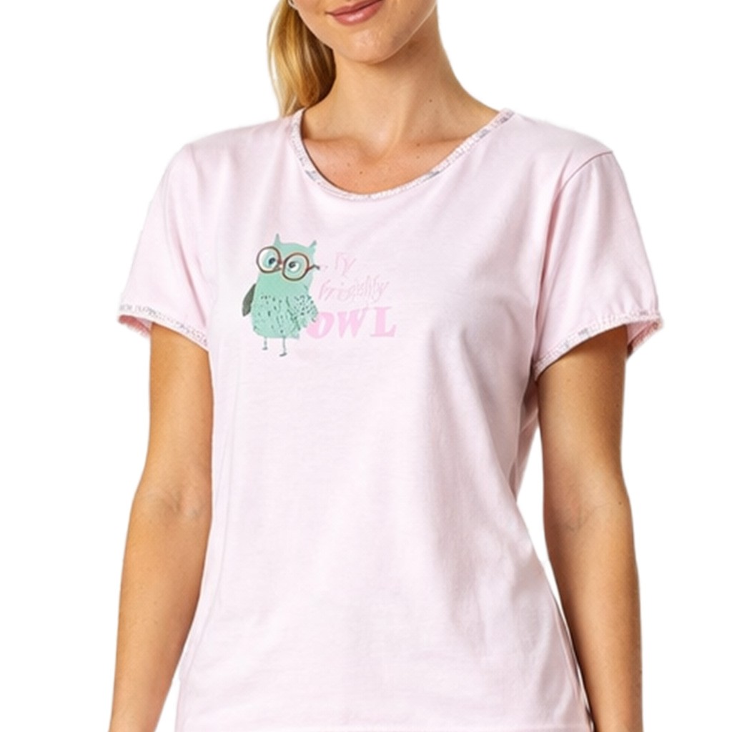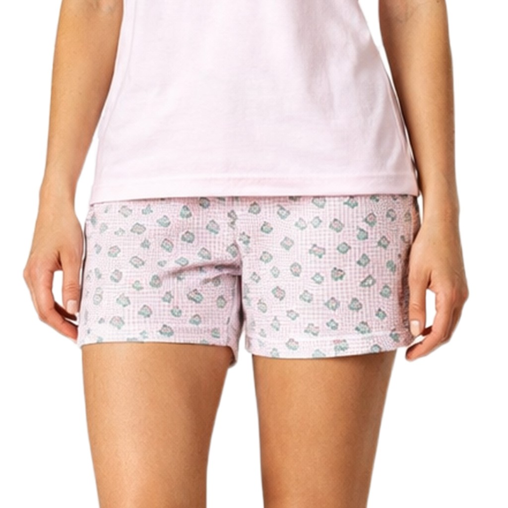 Pijama de mujer que combina camiseta de manga corta y cuello redondo con pantalón corto estampado, confeccionado en tejido de algodón. Presentado en caja.