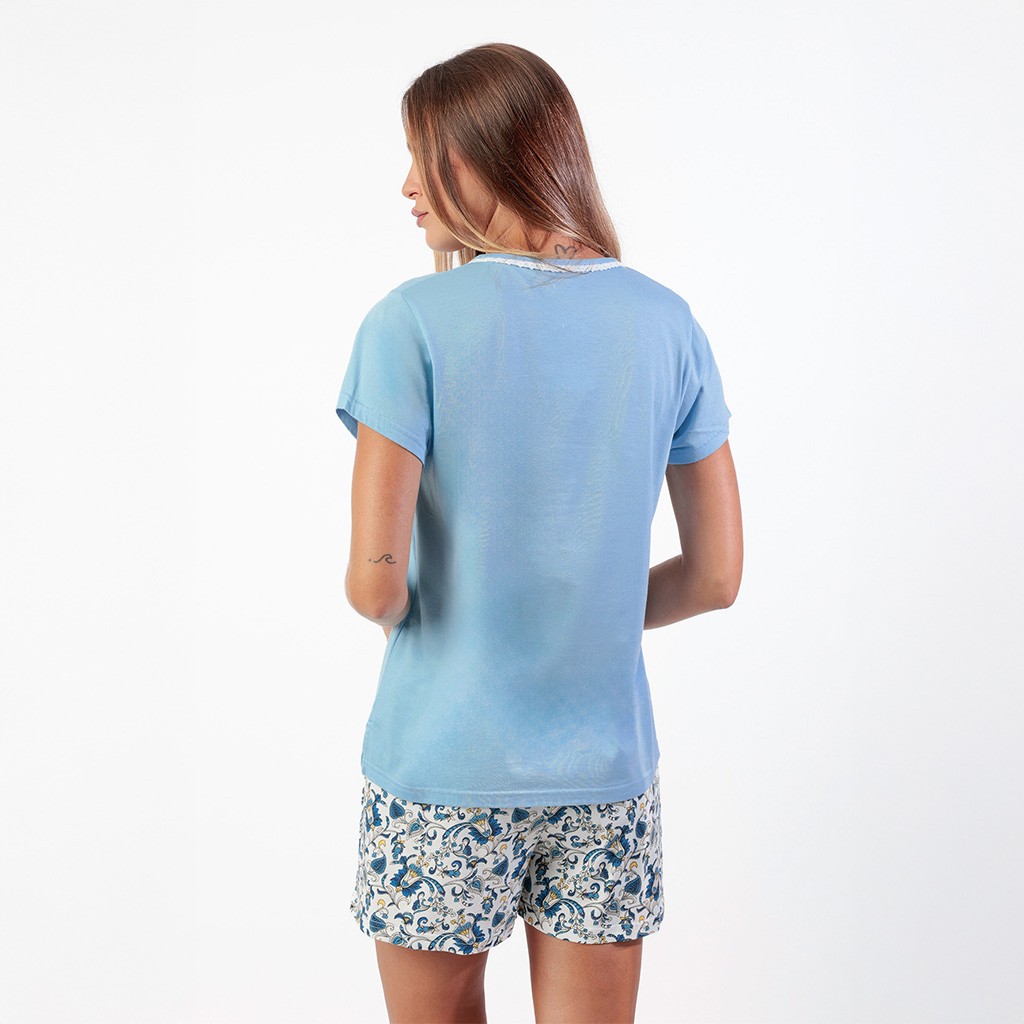 Pijama de manga corta para mujer confeccionado en tejido moda con camiseta de cuello con botones y pantalón corto estampado. Se envía en caja.