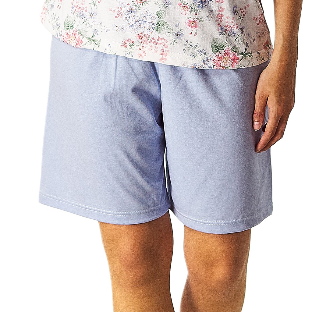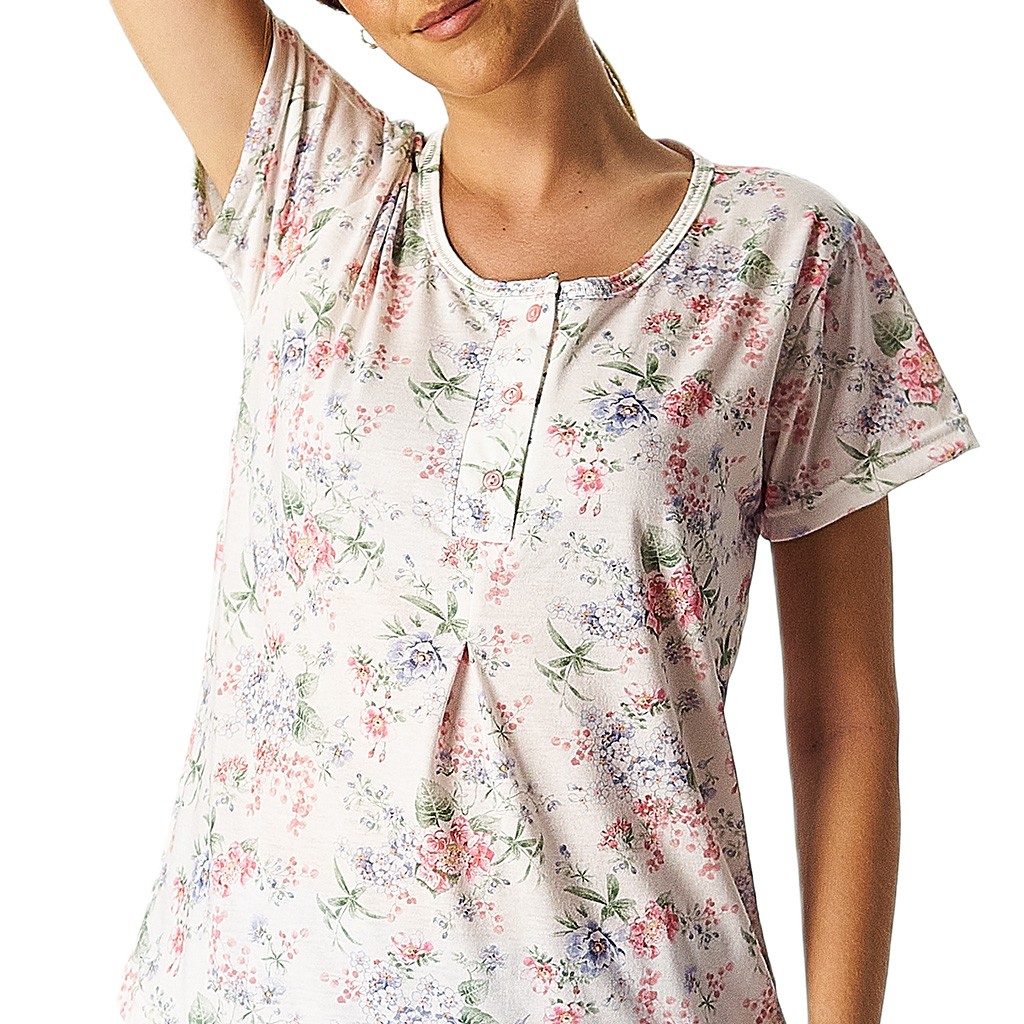 Pijama de mujer con camiseta de manga corta y cuello de botones con pliegue bajo pecho para mayor amplitud confeccionada en tejido de algodón estampado y que combina con pantalón en color liso de corto especial. Presentación en caja.