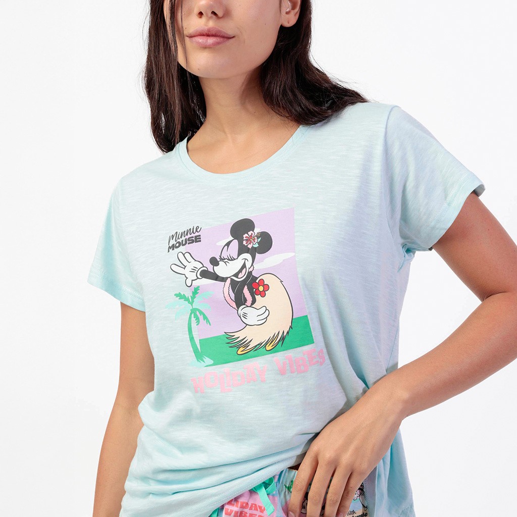 Pijama de mujer confeccionado en tejido de algodón que combina camiseta de manga corta con dibujo de Minnie impreso en delantero y pantalón corto con estampado a juego. Se envía en caja.