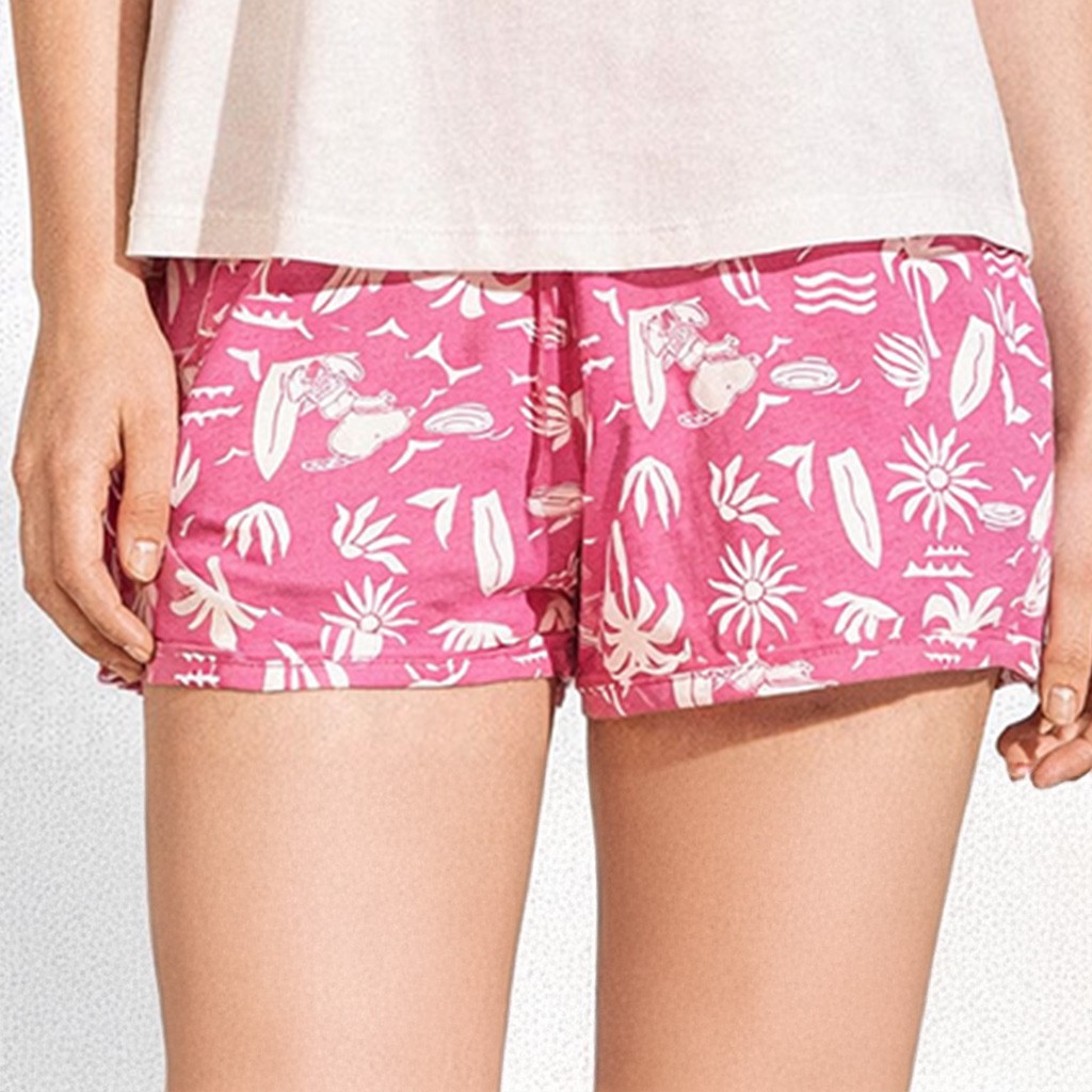 Pijama de mujer confeccionado en tejido de algodón que combina camiseta de manga corta con dibujo de Snoopy y pantalón corto estampado con cordón ajustable. Presentado en caja con diseño a juego.
