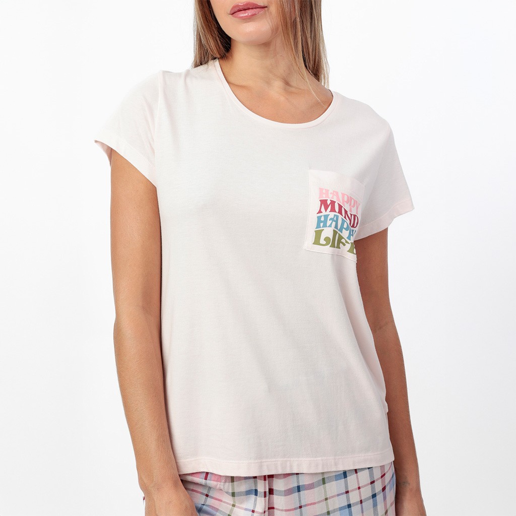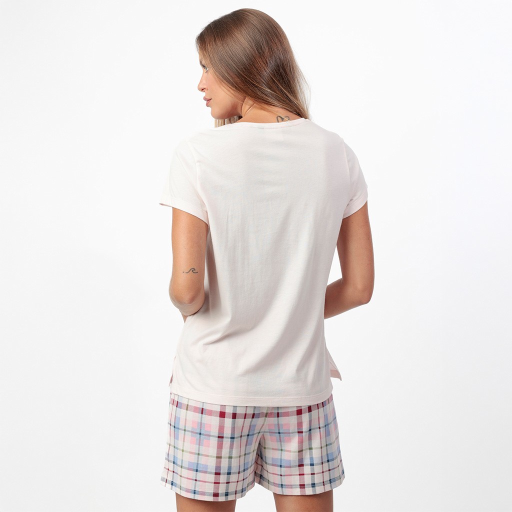 Pijama de mujer confeccionado en tejido de viscosa que combina camiseta de manga corta con cuello redondo y bolsillo en el pecho y pantalón corto de cuadros. Presentado en caja.