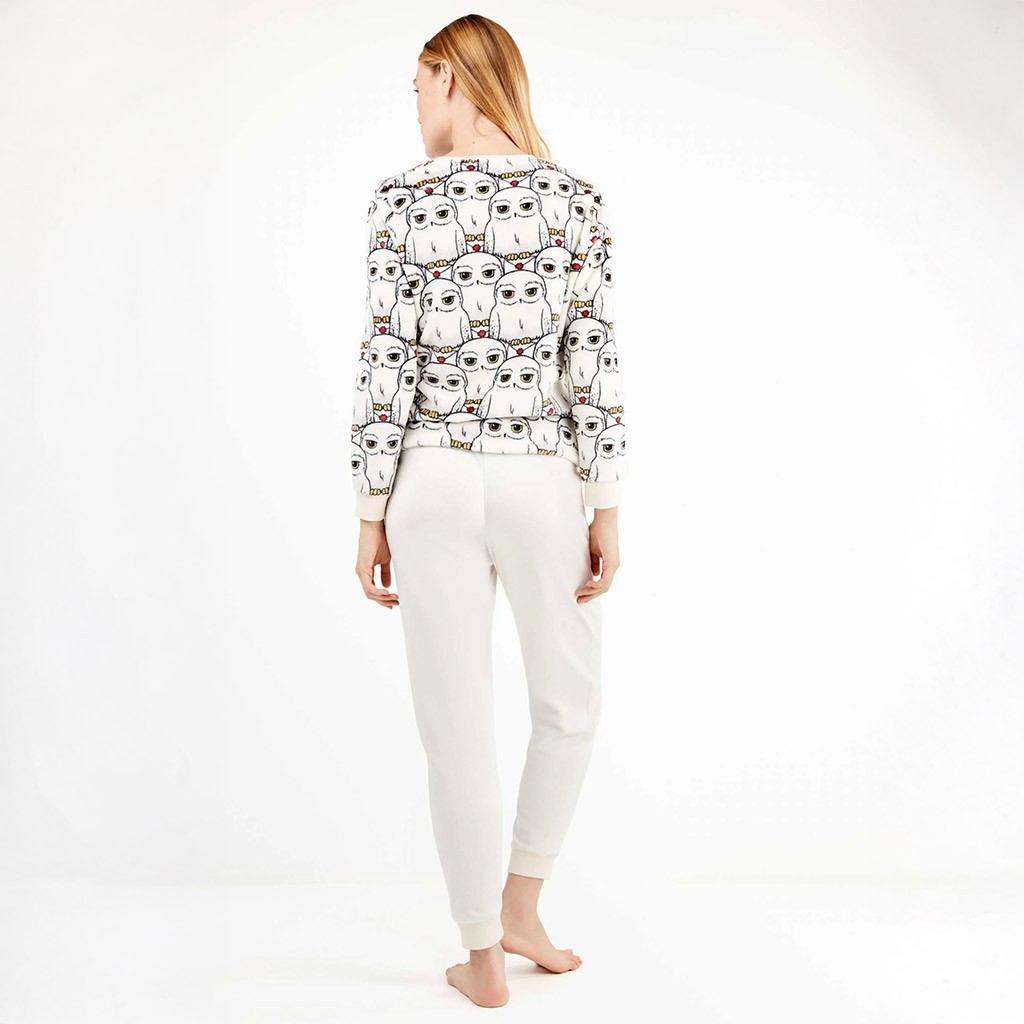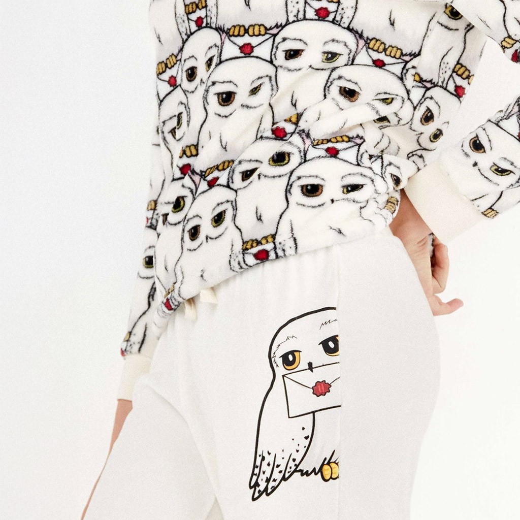 Pijama de mujer en cálido tejido de coralina estampado con diseño de Harry Potter que combina pantalón de color liso con cordón ajustable y sudadera con dibujos de lechuza.