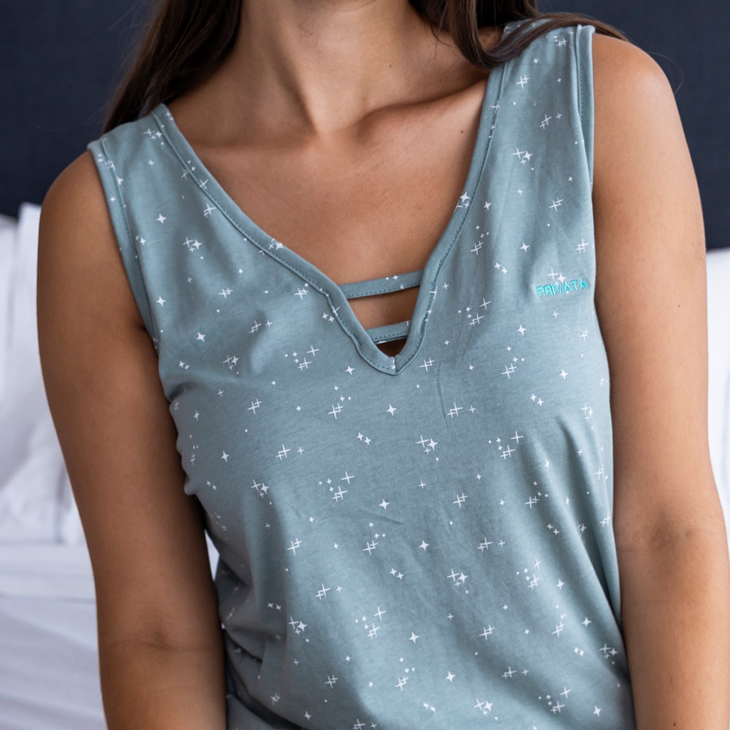 Pijama de mujer de algodón con camiseta de tirante ancho y pantalon corto a juego con estamados de pequñas estrellas sobre fondo verde.