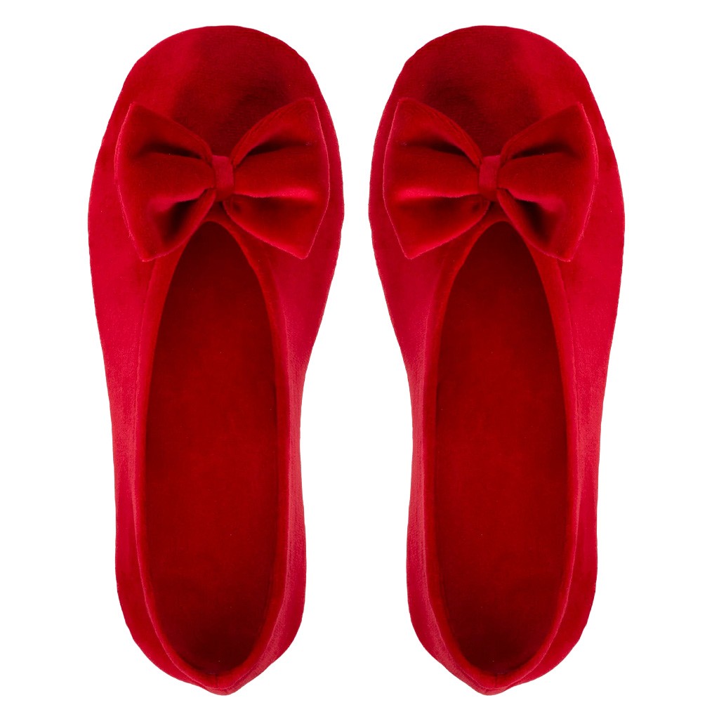 Zapatilla de casa de mujer en forma de preciosa bailarina de microterciopelo rojo con lazo y suelo de cuero con plantilla interior acolchada. Se adpata perfectamente al pie como una segunda piel.