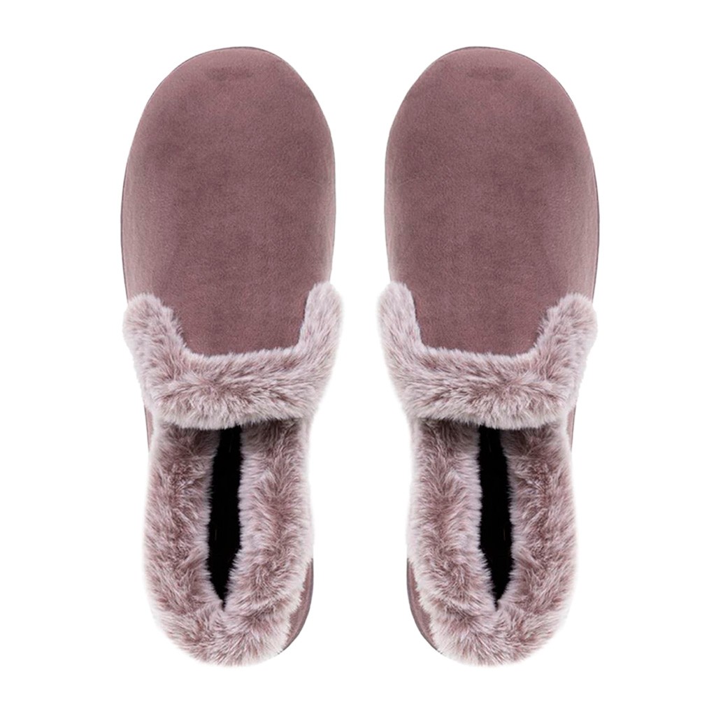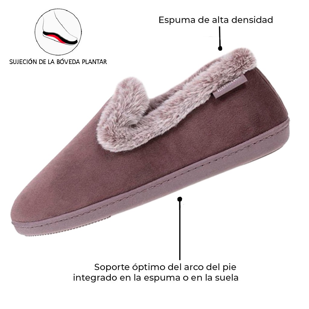 Zapatilla de mujer de suave tejido de terciopelo extrasuave en color liso. Plantilla interior de espuma de alta densidad y suela patentada con puente especial ergonómica que se ajusta perfectamente al pie. Forrada de pelo suave y cálido