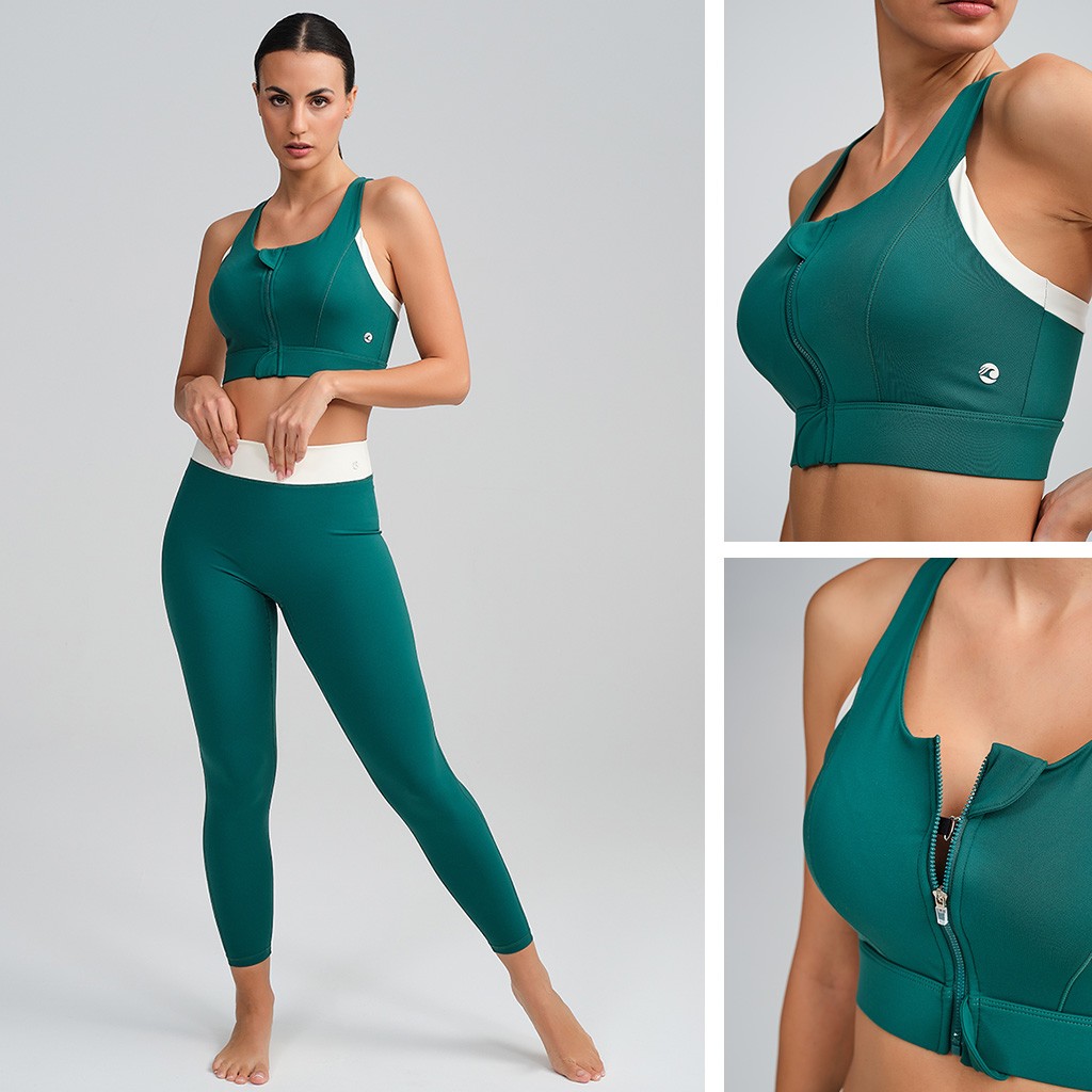 Sujetador deportivo de mujer confeccionado en tejido transpirable con cierre de cremallera con corchete de seguridad y copas interiores, espalda nadadora con costuras en color a contraste.