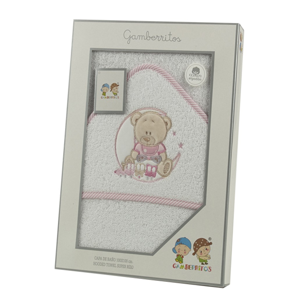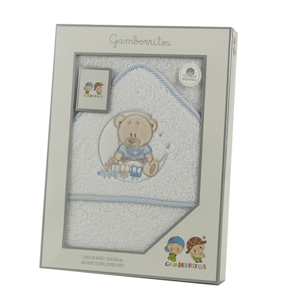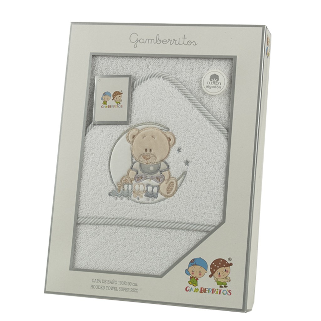 Capita de baño de bebe con bordado de osito sobre fondo blanco confeccionada en algodón 100 % y rizo americano. En caja de regalo.