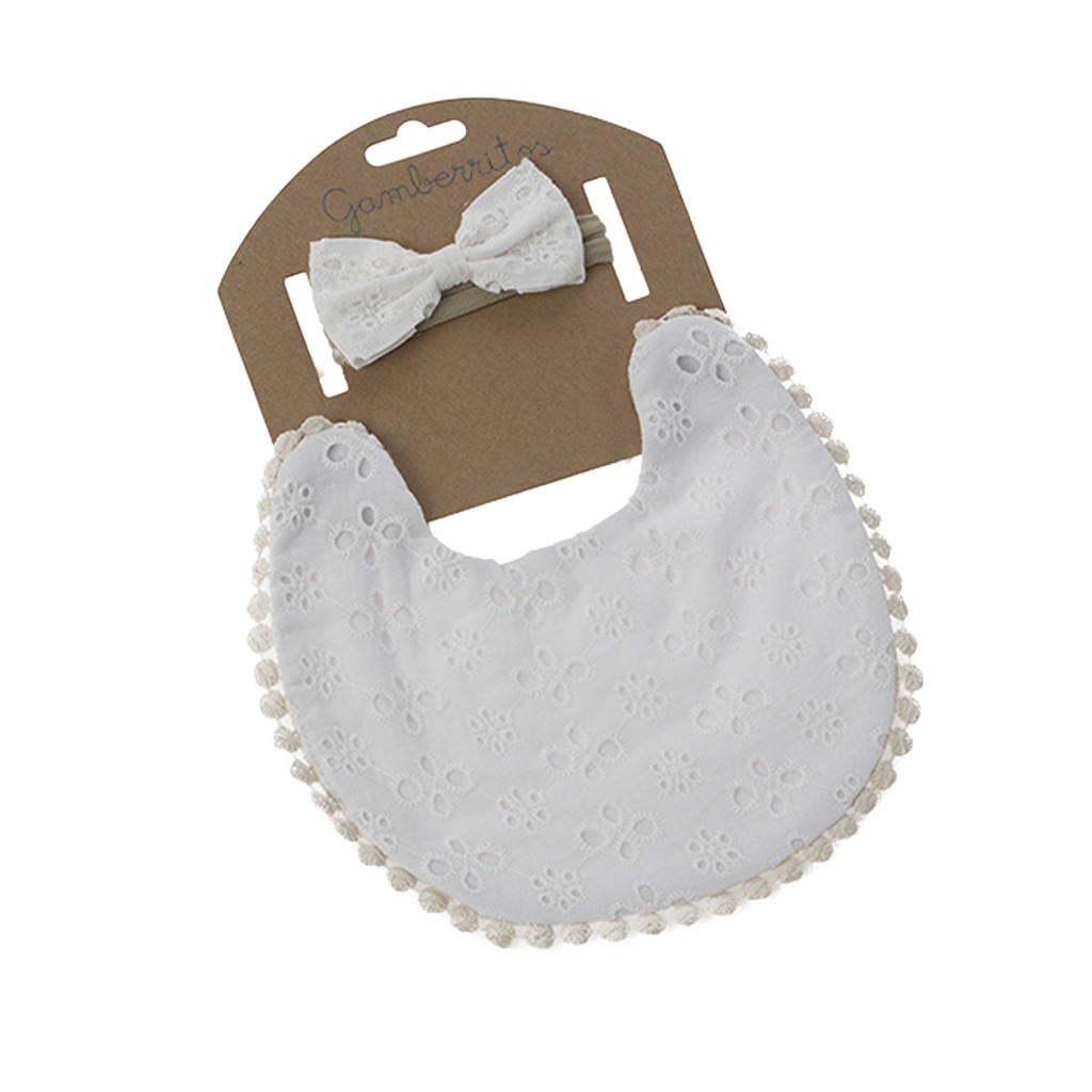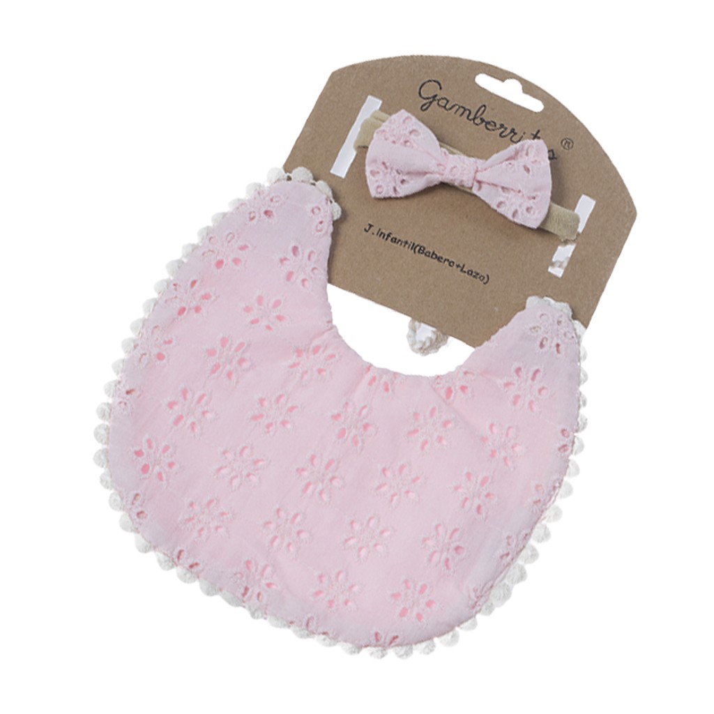 Set regalo de bebe con babero y lazo coletero a juego. Confeccionado en algodón calado en blanco o rosa.