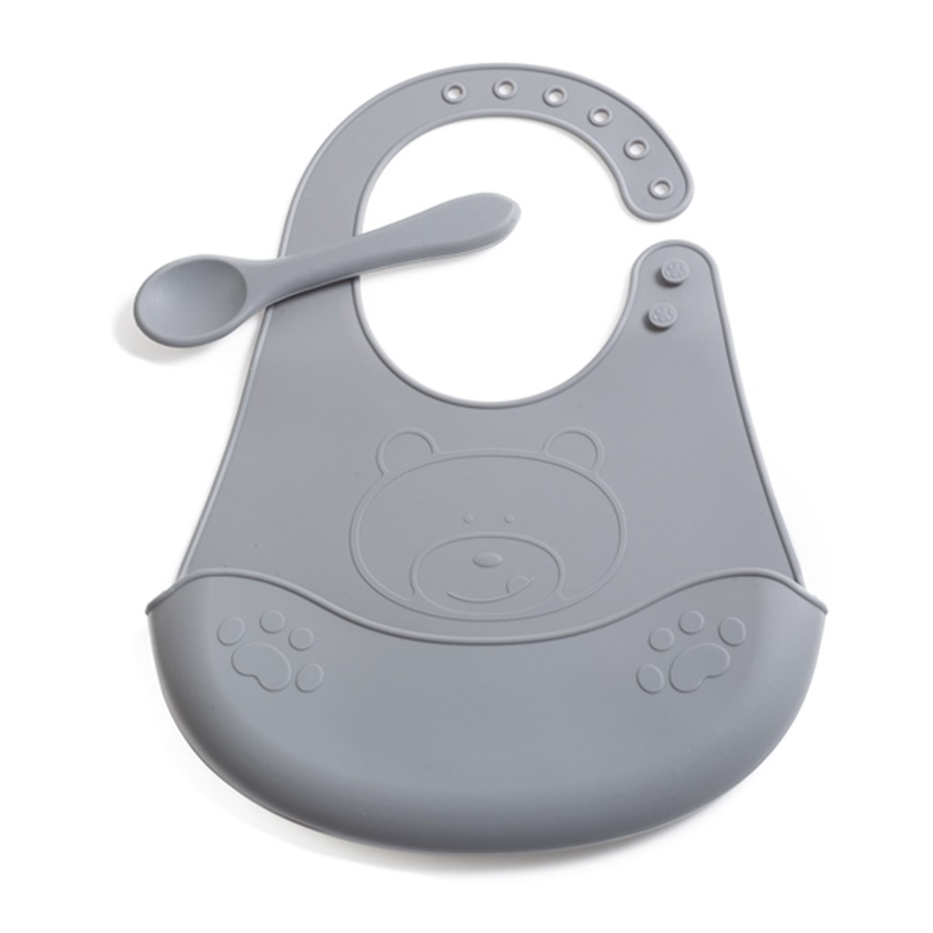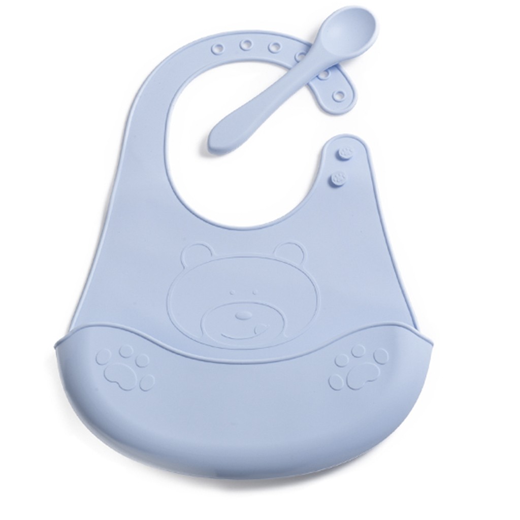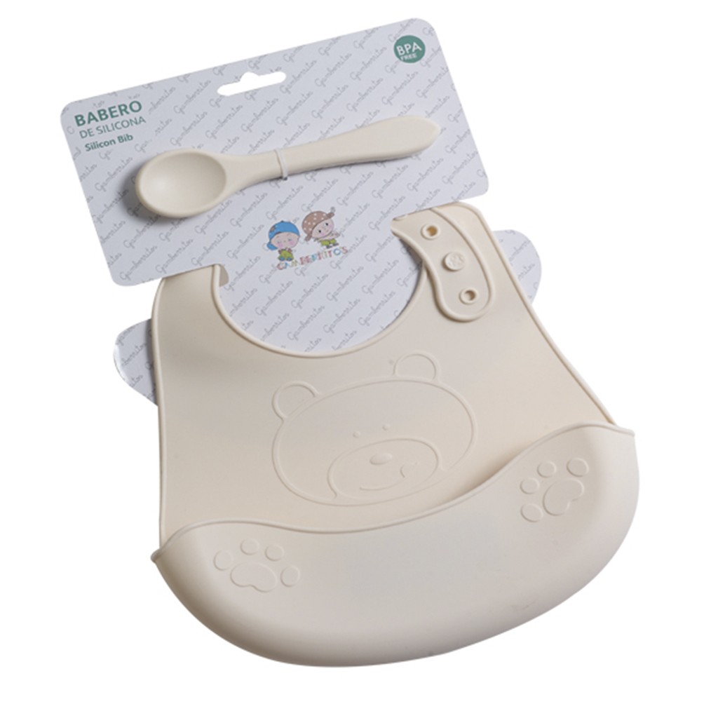 Babero de bebe de silicona alimentaria con recoje migas y cuchara de iniciacion incluida. diseño en forma de osito y cierre multiposiciones para mejor ajuste