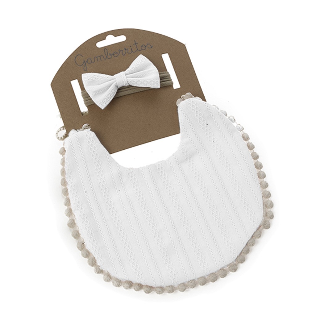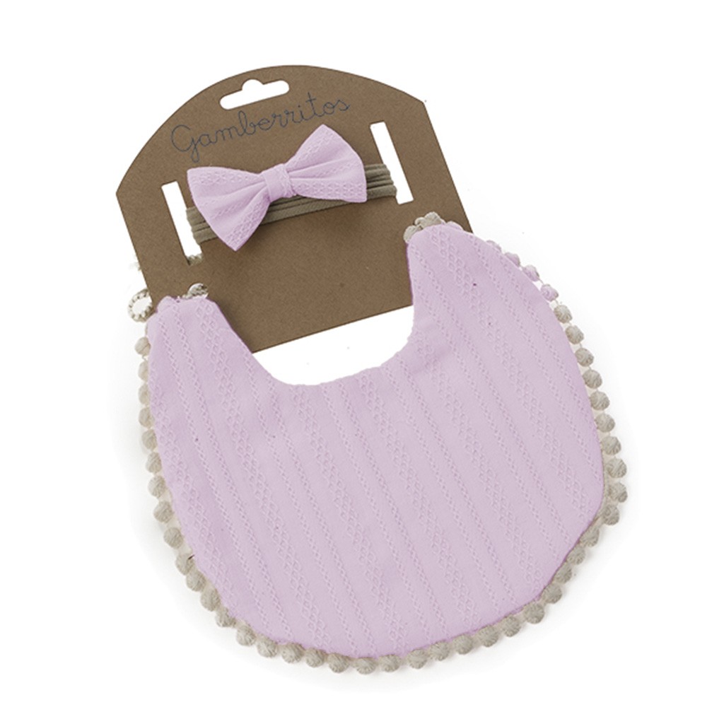 Juego de bebe con babero y lazo coletero a juego. Confeccionado en algodón con diferentes tejidos de fantasia o estampados.