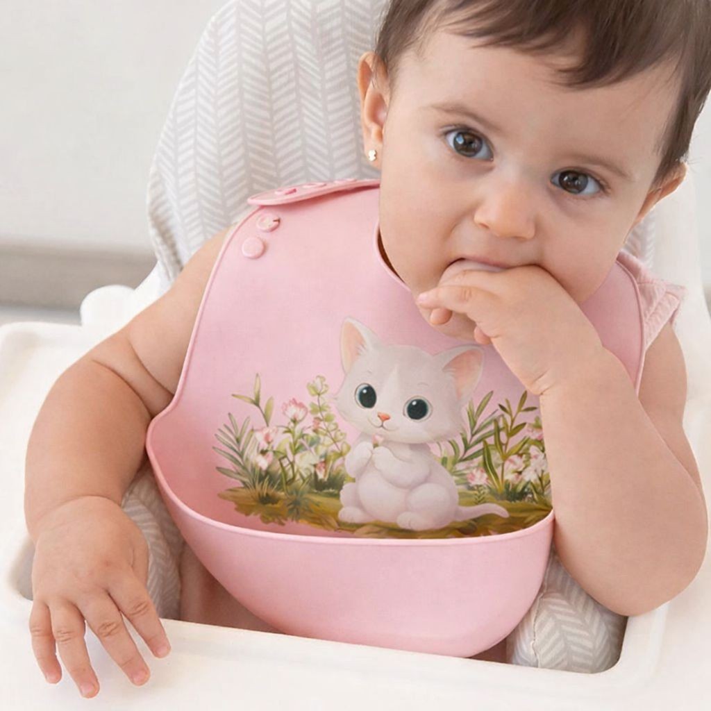 Babero para bebé de suave silicona totalmente impermeable y con recogemigas. De fácil limpieza y muy comodo para el bebé es ajustable en 7 posiciones. Colección gatito rosa de kiokids.