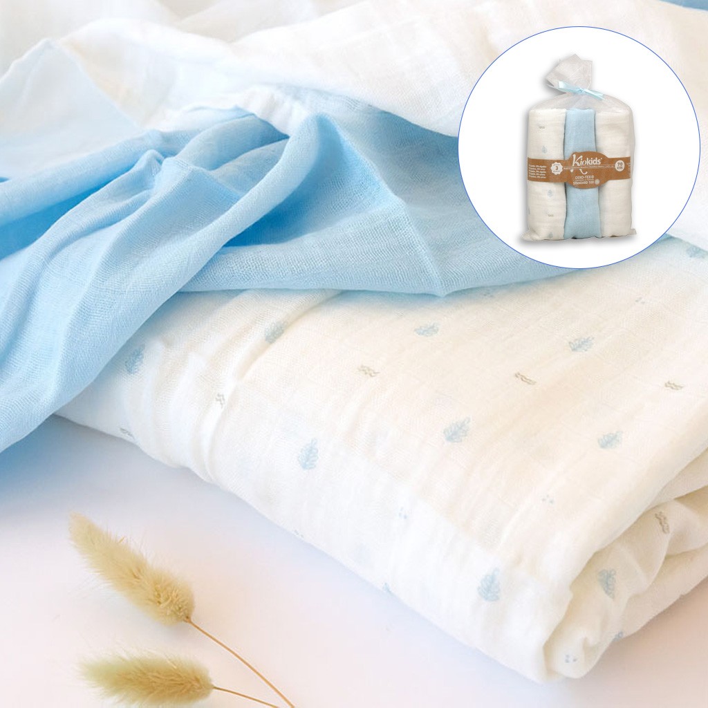 Pack de 3 gasa de bebe en saquito de regalo colección petits moments azul de Kiokids. Confeccionada en 70 % Bambú y 30% Algodón , son antialergicas y termoclímaticas ideal para verano e invierno. Set de 3 surtidas medidas 70 x 70