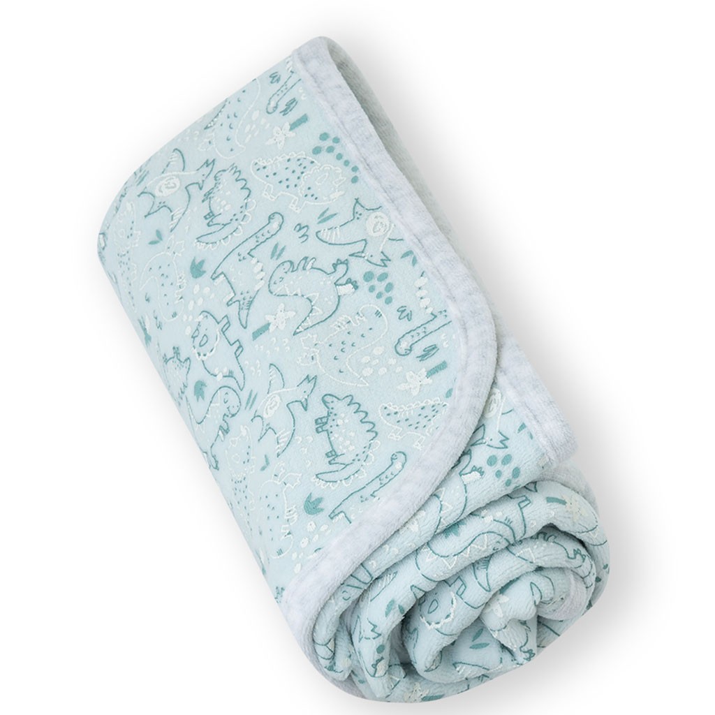 Arrullo de algodón con estampado de dinosaurios en azul. Suave, ligero y transpirable, pensado para envolver al recién nacido con total confort. Ideal para la canastilla y para mantener al bebé abrigado en casa o de paseo.