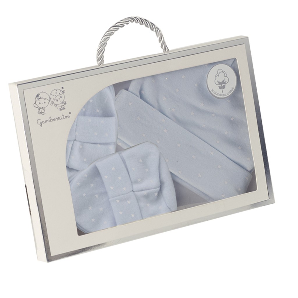 Set de regalo para recien nacido con gorrito y manoplas estampadas con estrellas. Confeccionado en tejido de suave algodón con bambú. En cajita de regalo ideal para incluir en cestas.