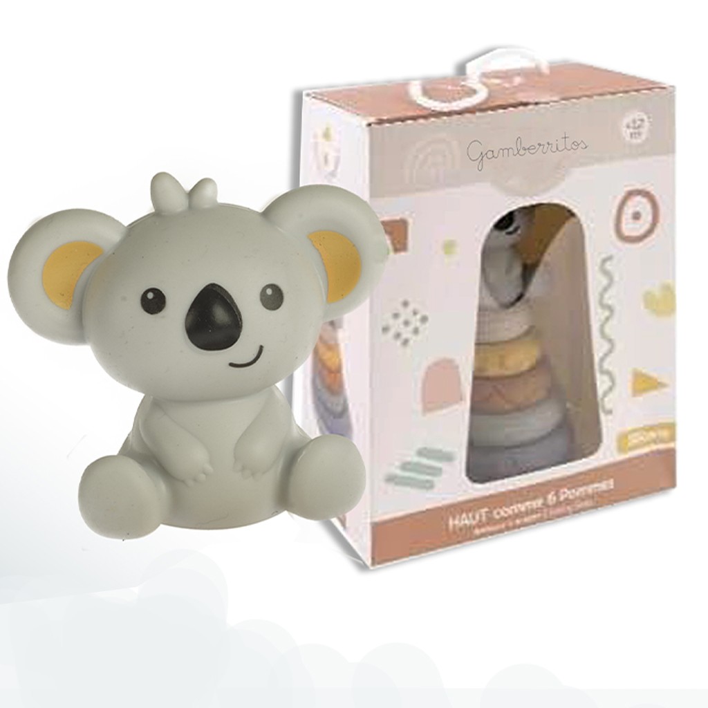 Torre apilable con figura de koala que incluye varias piezas circulares en diferentes tamaños y colores ideal para estilular la coodinacion y motricidad del bebe. En cajiota de regalo.