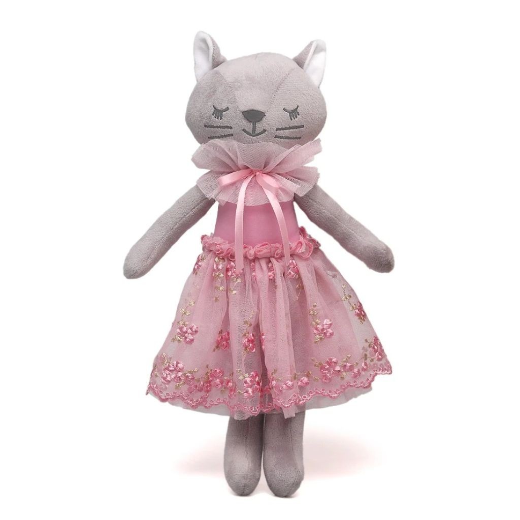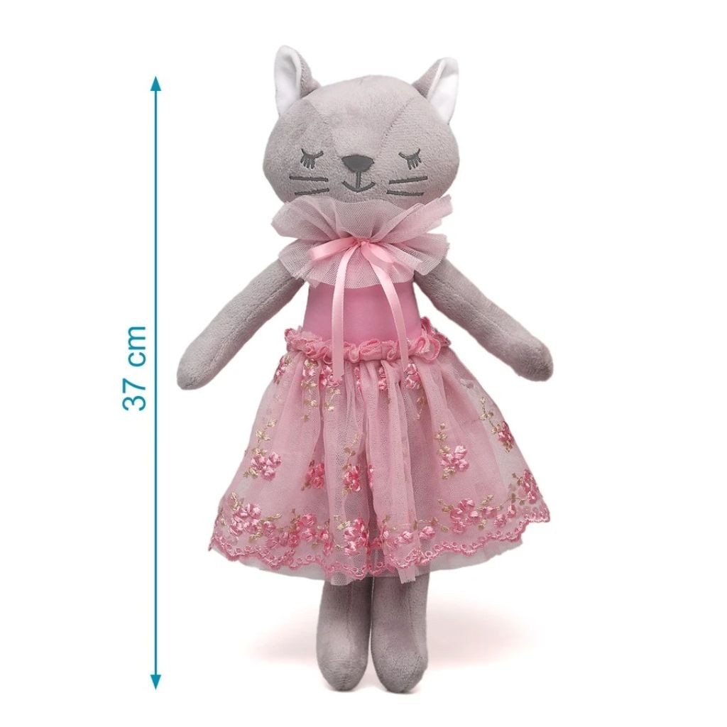 Preciosa muñeca de trapo con forma de gatito gris con vestidito de tul bordado. Confeccionada con materiales blanditos y ligeros. Agradable de abrazar y perfecta para acompañar a todas partes.