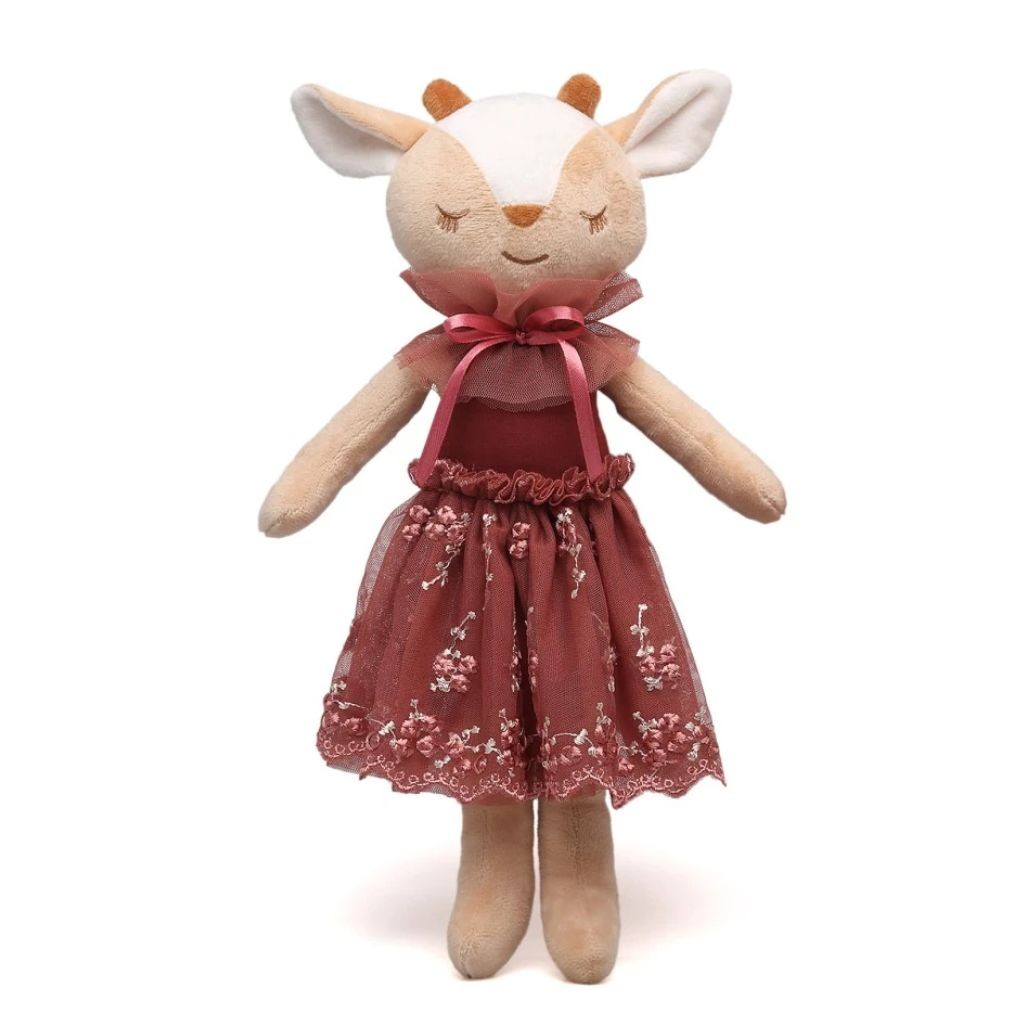 Preciosa muñeca de trapo con forma de ciervo con suaves orejitas y vestidito de tul bordado. Confeccionada con materiales blanditos y ligeros. Agradable de abrazar y perfecta para acompañar a todas partes.