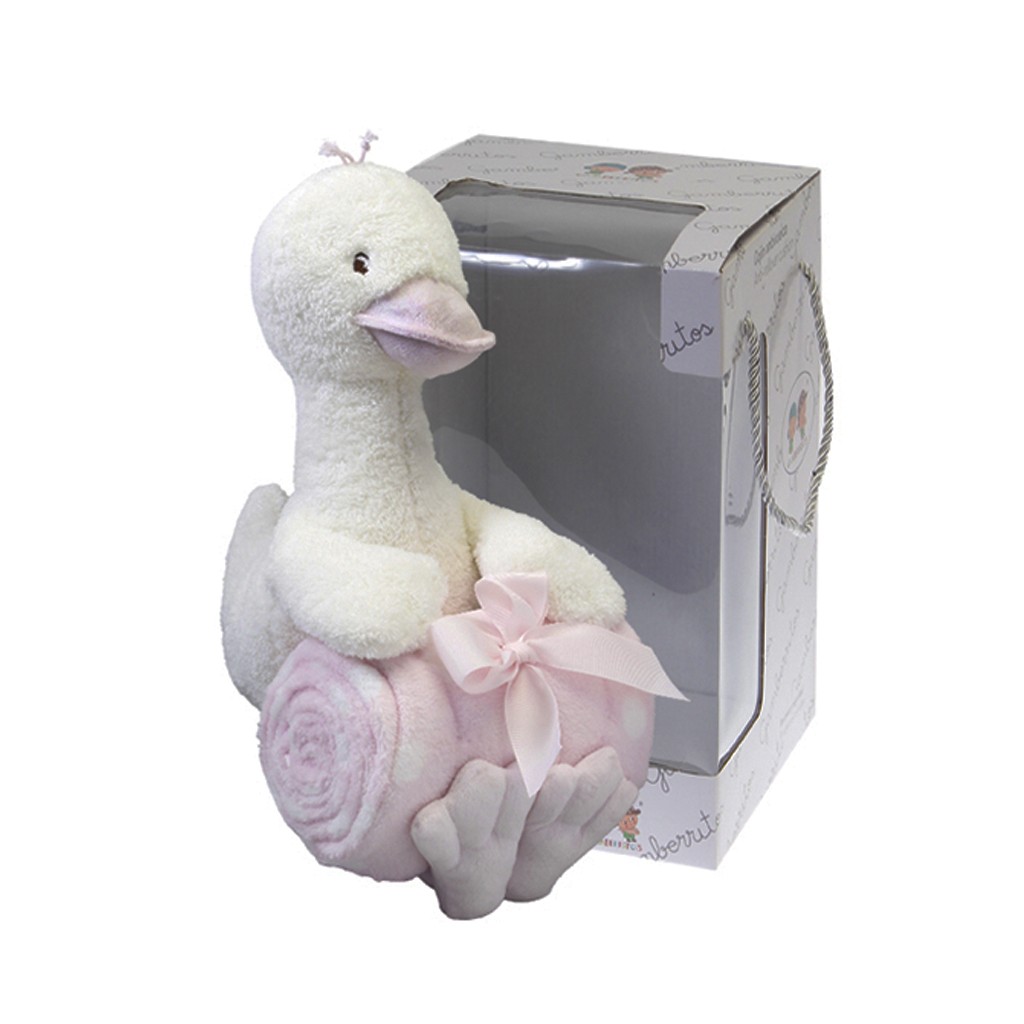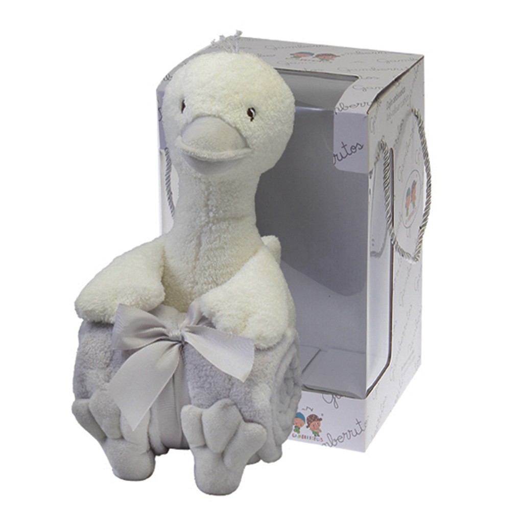 Peluche bebe oca con manta coralina a juego. Gamberritos