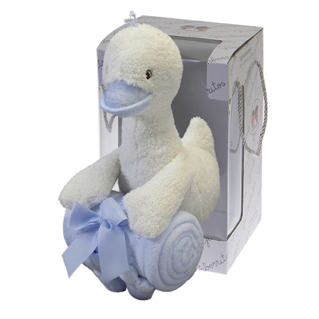 Gracioso peluche de bebe en forma de oca con manta a juego. Se envia en un envase con celofán y lazo ideal para regalo.