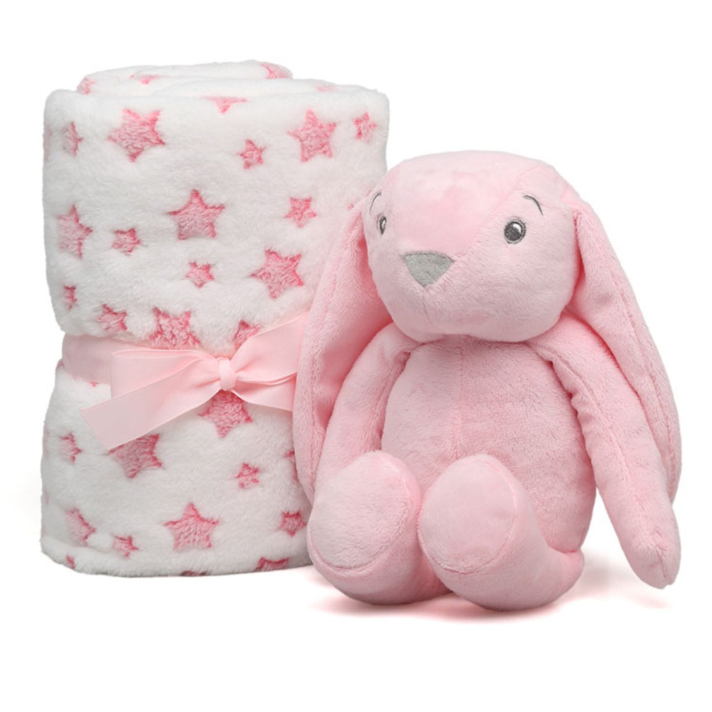 Suave conejo de peluche rosa, acompañado de una mantita polar con estampado de estrellas. Ideal para acompañar al bebe y perfecto para abrazar. Se envia en una preciosa caja de regalo.