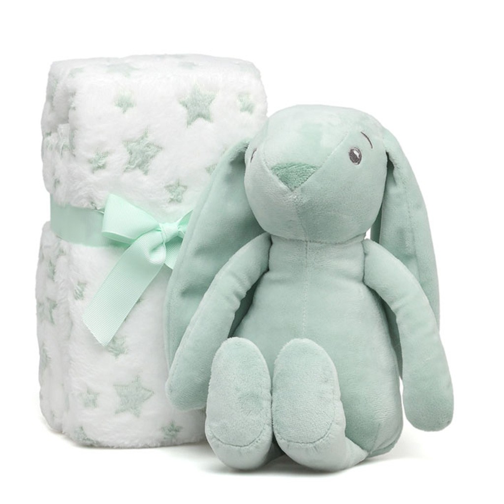 Suave conejo de peluche verde acompañado de una mantita polar con estampado de estrellas. Ideal para acompañar al bebe y perfecto para abrazar. Se envia en una preciosa caja de regalo.