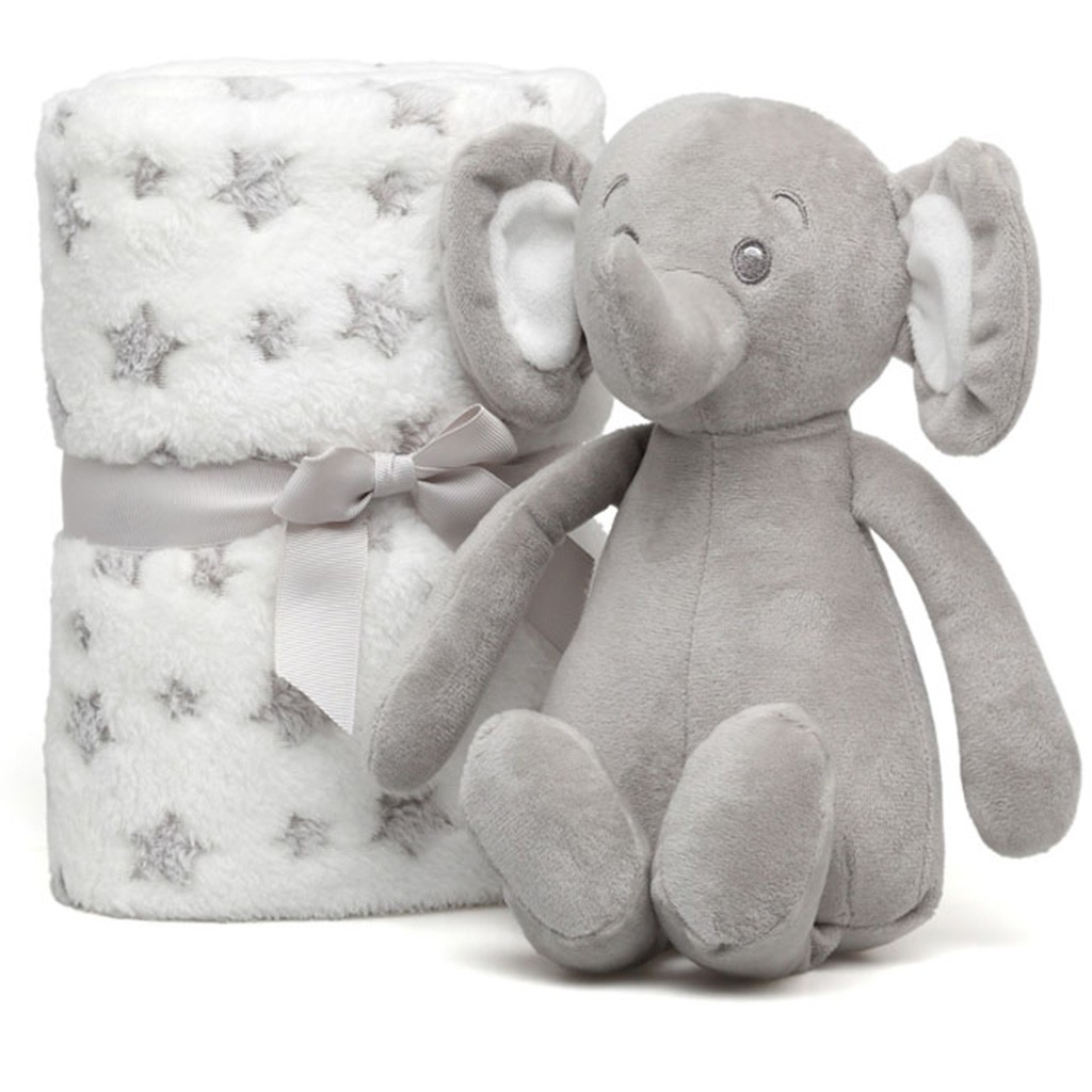 Suave elefante de peluche gris, acompañado de una mantita polar con estampado de estrellas. Ideal para acompañar al bebe y perfecto para abrazar. Se envia en una preciosa caja de regalo.