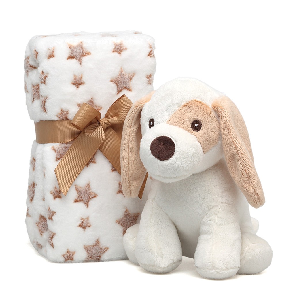 Suave y precioso perro de peluche blanco acompañado de una mantita polar con estampado de estrellas. Ideal para acompañar al bebe y perfecto para abrazar. Se envia en una preciosa caja de regalo.