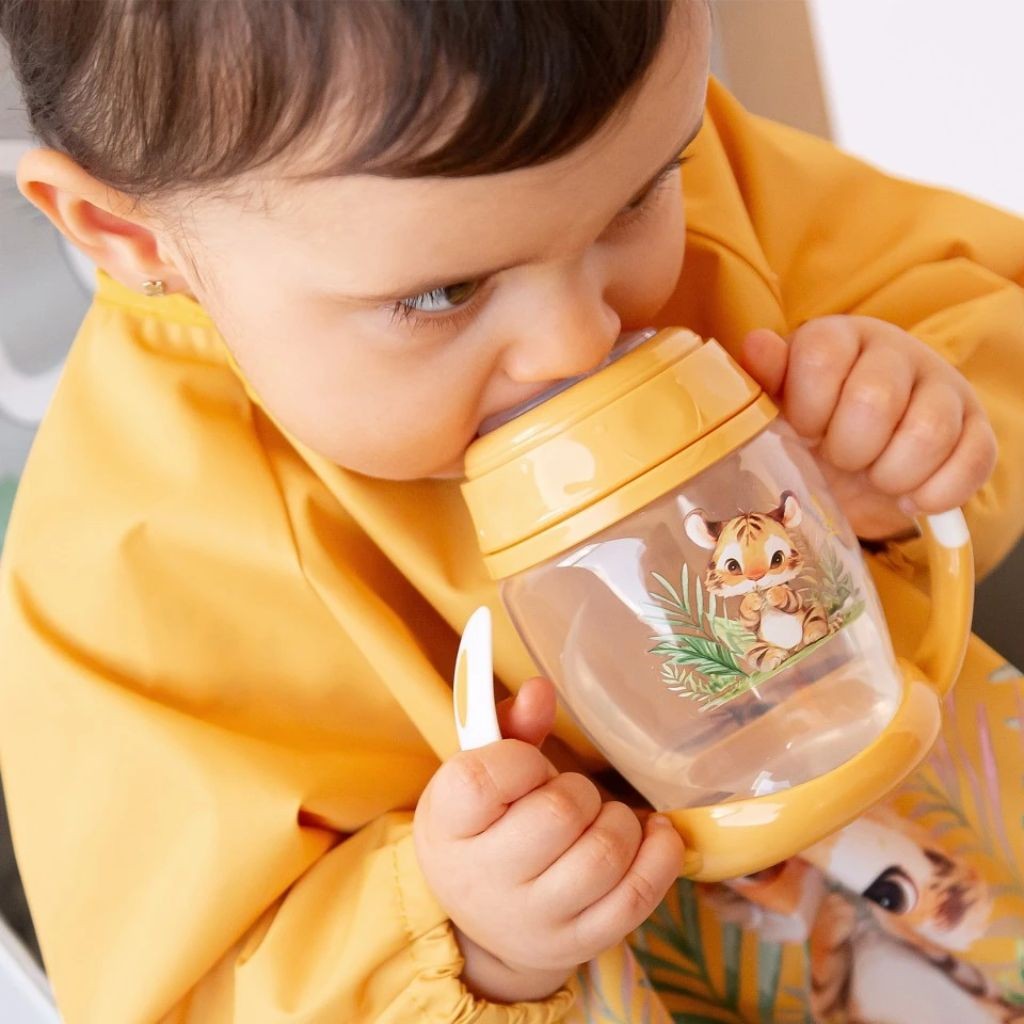 Taza de aprendizaje para bebé con asas de la colección tigre mostaza. Con tetina Step de silicona y la textura como un biberón con efecto succión de gran caudal que ayuda al aprendizaje. Sistema anticólico