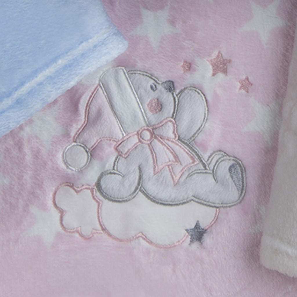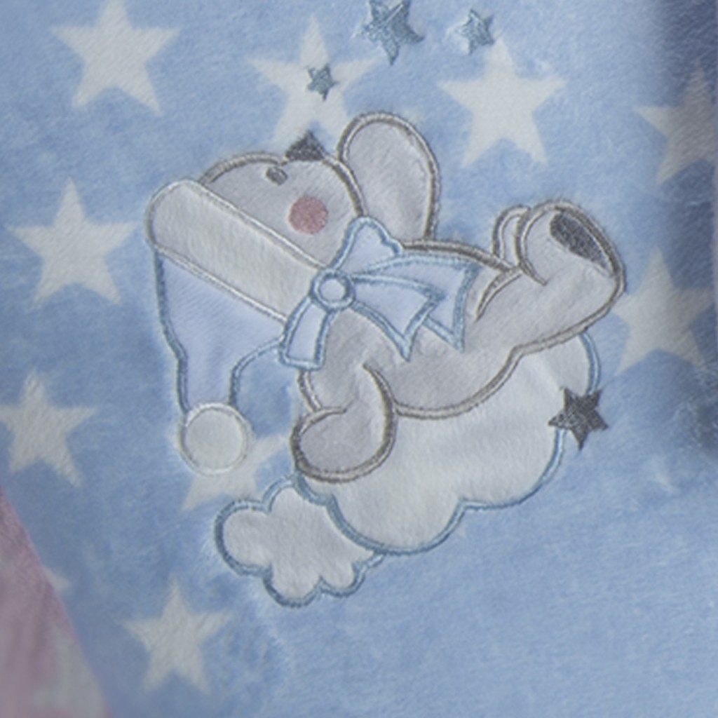 Juego de sabanas de cuna de 120 x 60 de suave y cálida doralina con bordado osito y estrellas . Se compone de sabana bajera, encimera y funda de almohada y se envía en caja de regalo.